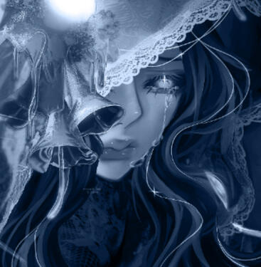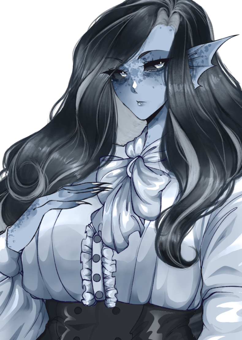 APPEARANCE Cetus bears pulchritude of something beastly and yet, longingโ soft blue skin flecked with freckled patterning more prominent on her cheeks and bridge of her nose. She has expressive webbed ear-fins, long cetacean tail, and strong legs with padded, clawed, webbed digitigrade feet giving her a rather inhuman look with her hands as well that carry a clawed motif with light padding.Her thick, inky, black hair streaks with white, with yet a white underside that is more visible when held in uptied hairstyles and curl naturally when product had not been applied.Cetusโ eyes gleam with white irises in contrast to the dark sclera, resembling the false โeyeโ of orcas.Her clothing style remains very vintage, old, or even outdated in some cases. Donning frilled blouses adorned with cravats and ribbons, lengthy skirts or dresses that lace up from behind that obscure her feet. She is very modest in her choice of attire.